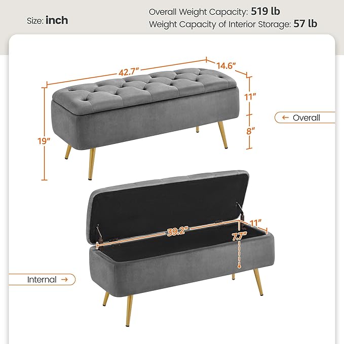 - Selected Materials, Soft To Sit: This modern tufted storage bench, made with skin-friendly soft polyester velvet and filled with high-density foam, is highly intensive, long-wearing, anti-deform, soft to touch, and bouncy to sit