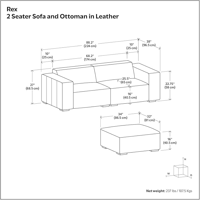- 2-PIECE SOFA AND OTTOMAN SET: Living room furniture set includes the Rex 2-Seater Modular Sofa (38" D x 88" W x 27" H; supports up to 600 lbs) and matching ottoman (32" D x 34" W x 16" H; supports up to 300 lbs)